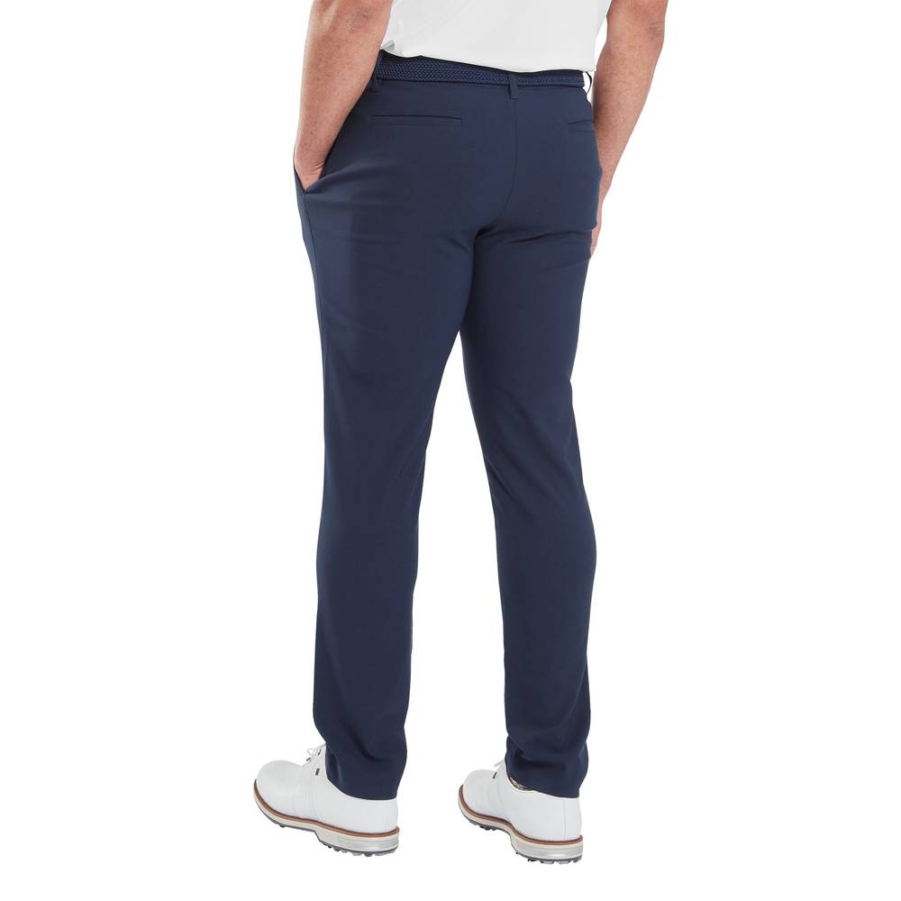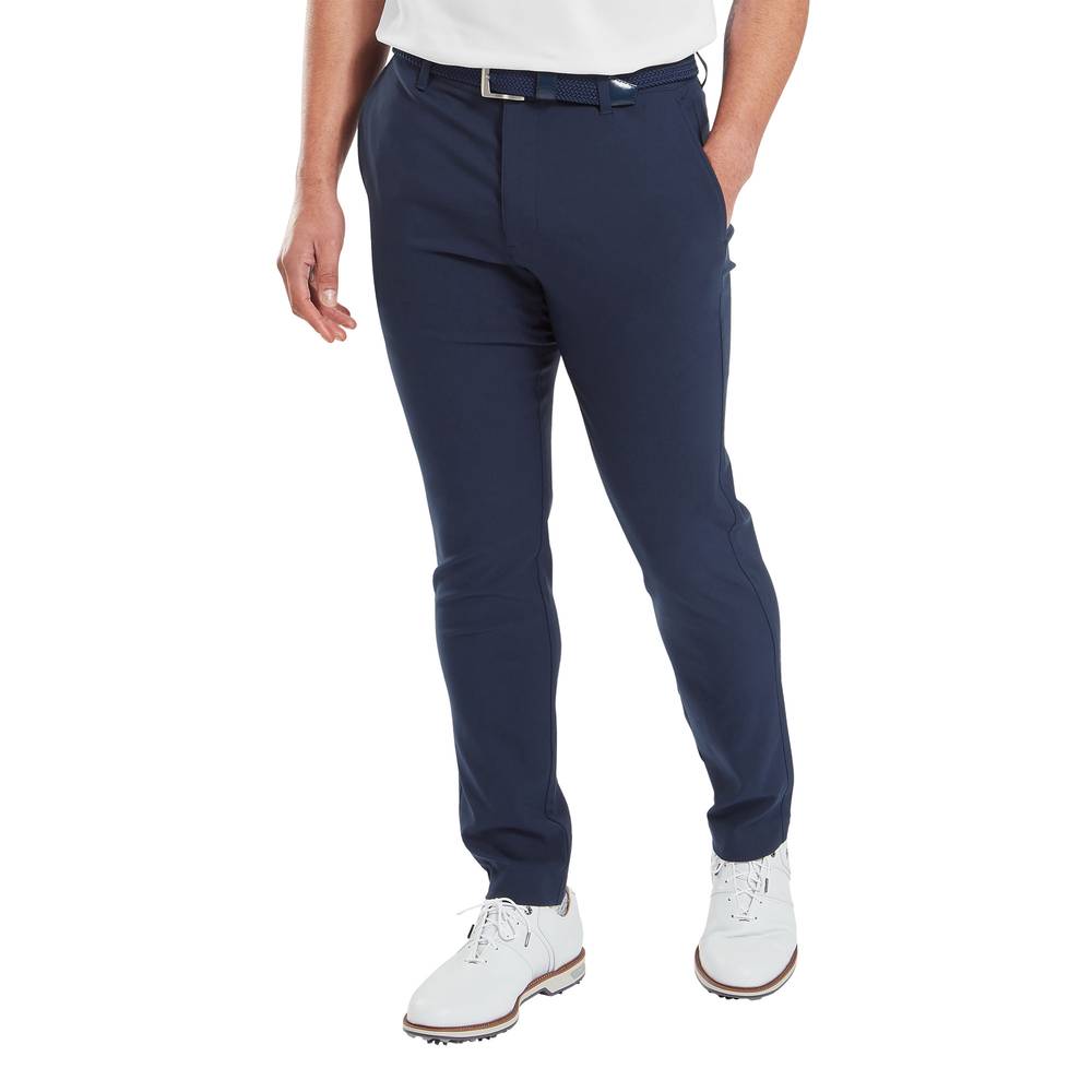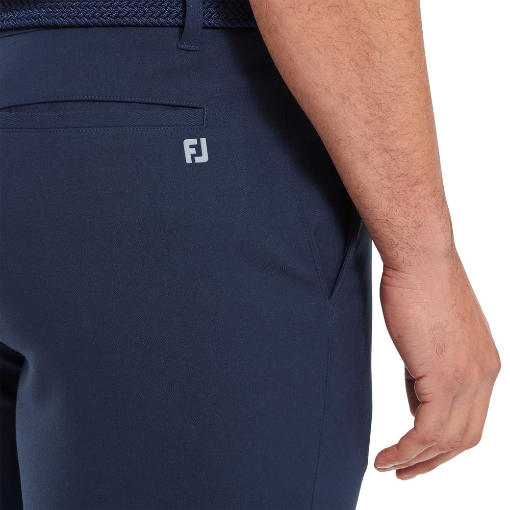 Mens FootJoy FJ Par Golf Trousers. A tapered fit trouser constructed in a lightweight fabric for breathability and comfort in warm conditions. Features gripper tape inner waistband for a secure fit, front zip shank fly and button closure.