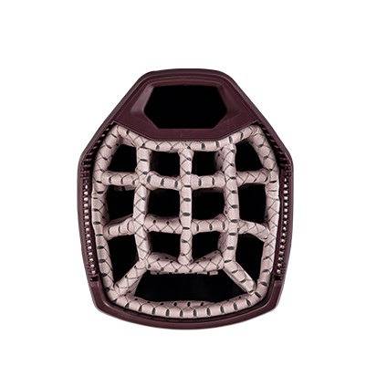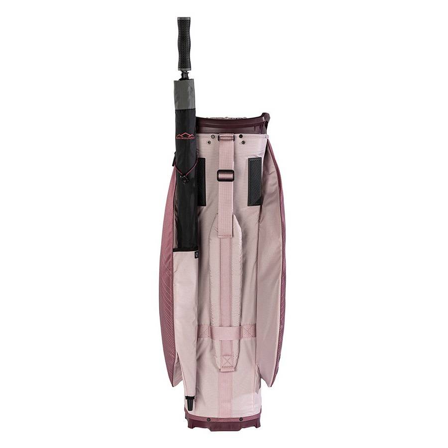 Waterproof cart bag with 8”€ x10”€ (20x25cm) opening and bottom-to-bottom dividers for 14 clubs, including a larger compartment for a putter. Integrated lifting handles.